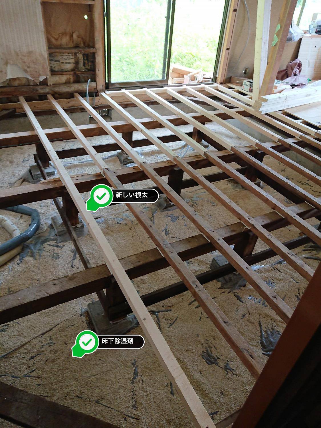 [/box]キッチンは前回大引きまで終わっていましたが、その上に根太も新しくなって施工され、床下の調湿剤も施工しました。※写真で根太が乗っていない部分は水道工事の配管作業中だったので後回しにした部分です。