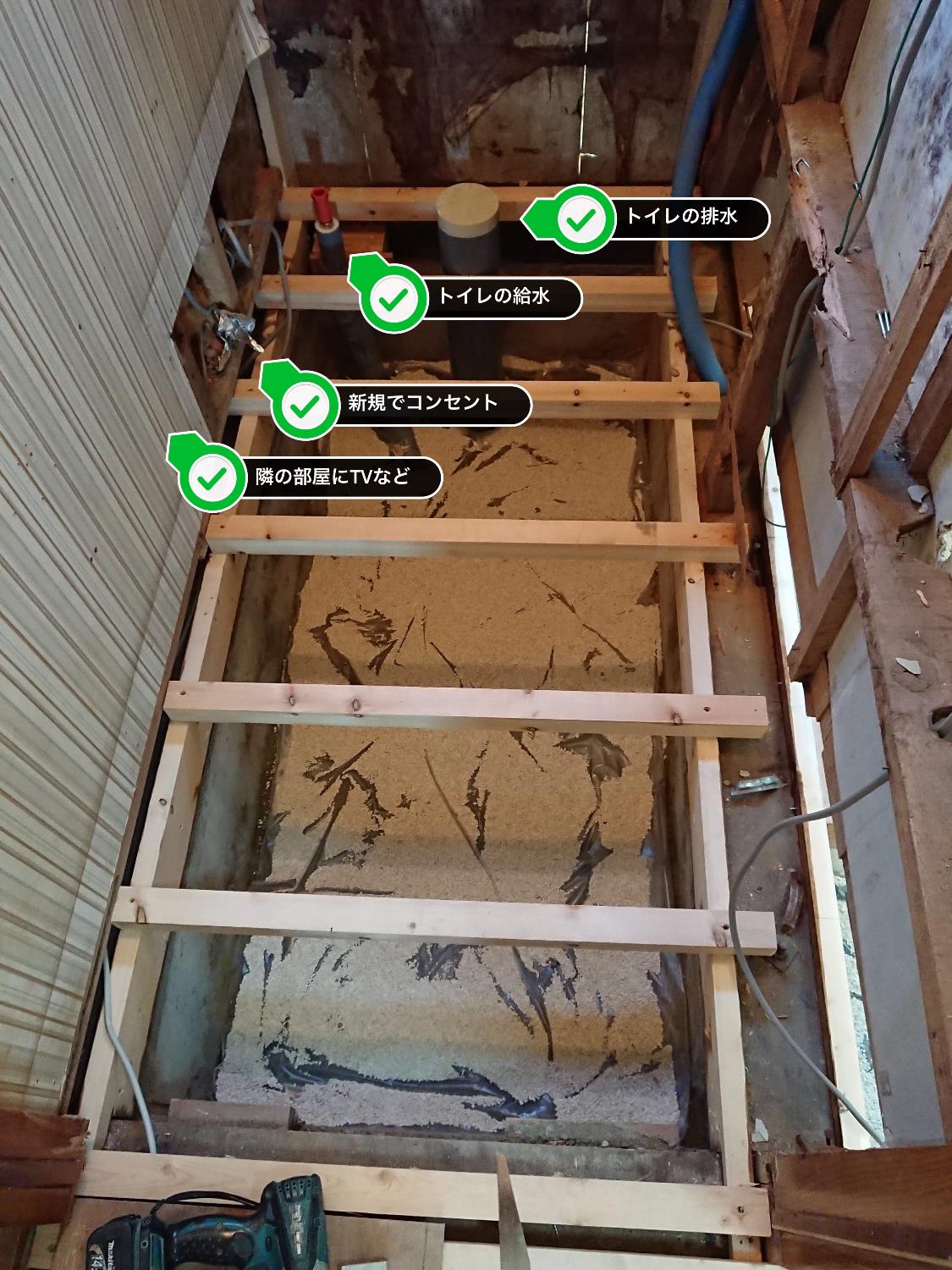 トイレも配管、調湿シート、調湿剤完了。隣の部屋にTVコンセントと電気コンセントも追加です。根太まで完了。