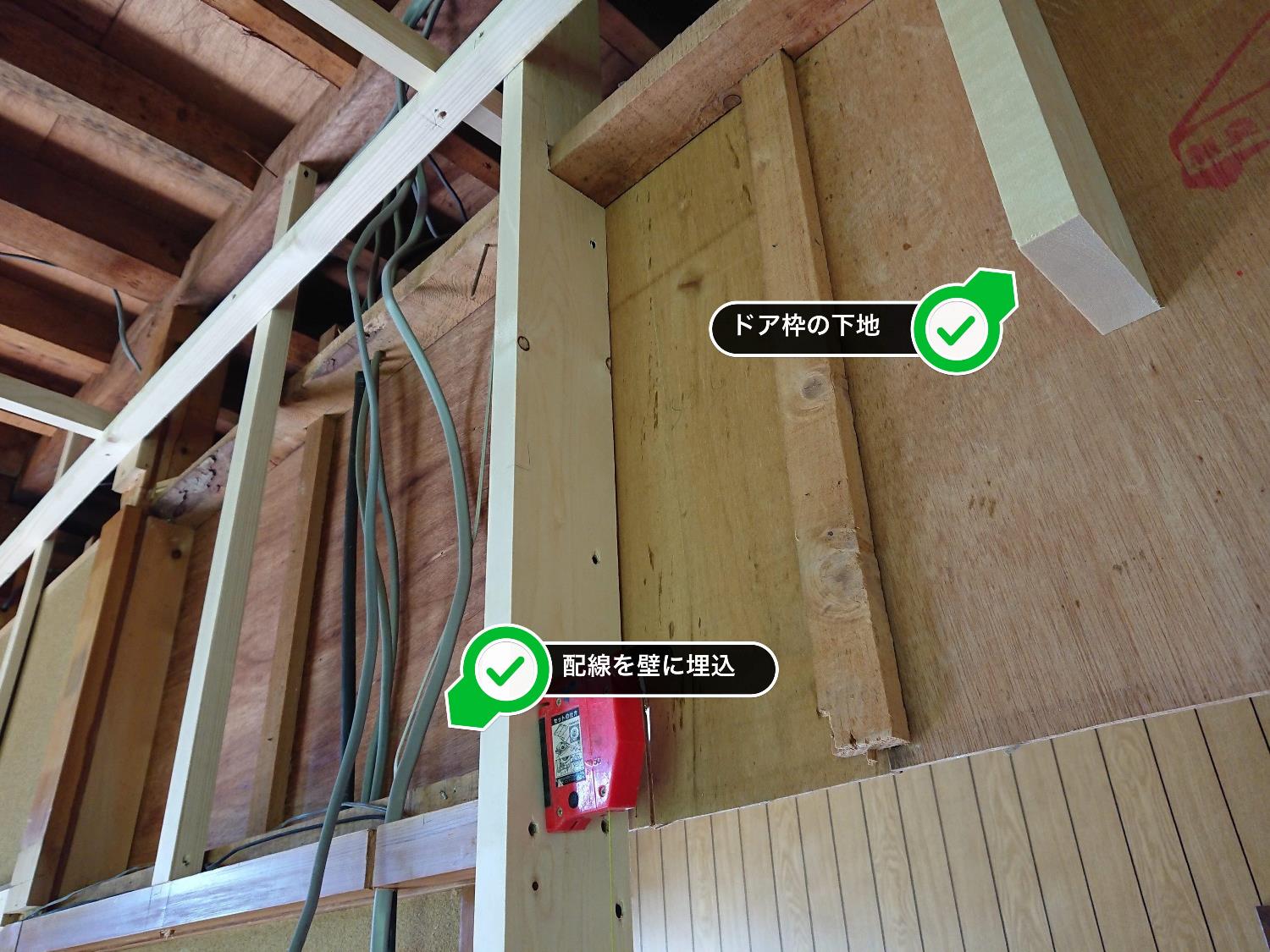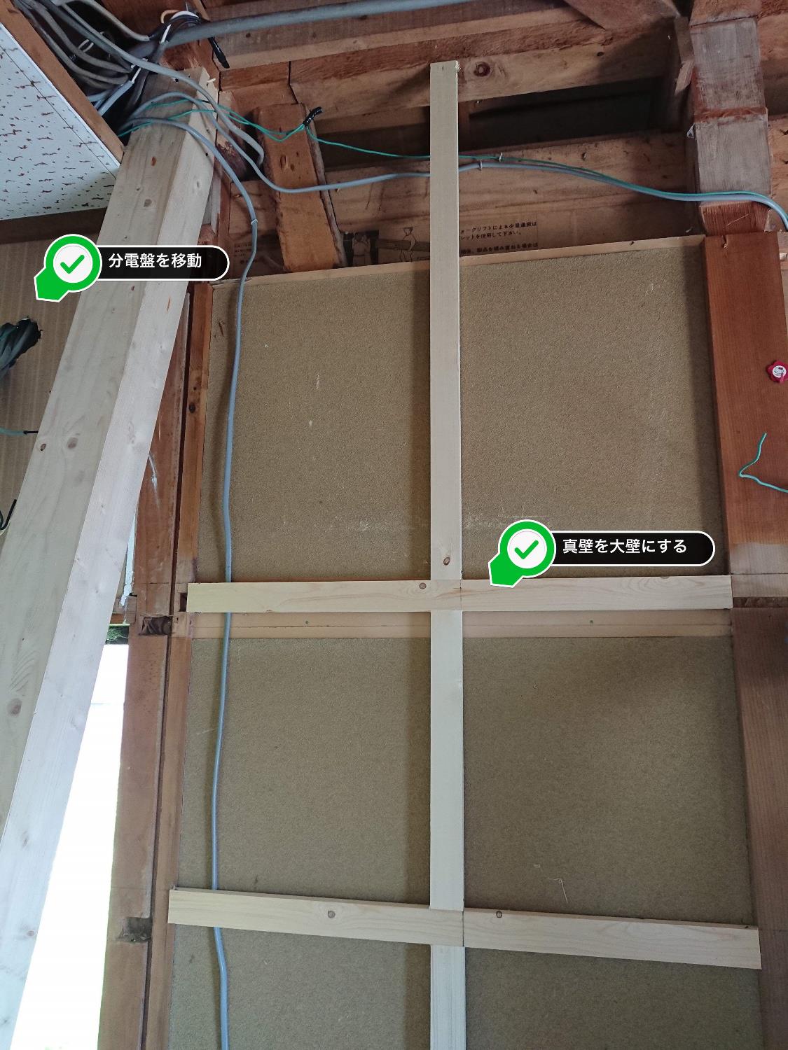 リビングの入り口は片引戸からドアへ変更します。これにより、平面として使える壁の面積が増え、1.5間分のスペースを活用できるようになります。ドア枠を入れるための下地を組み始めました。また、その際、廊下側の照明のスイッチなどがドアのサイズ変更により位置変更が必要になったり、むき出しだったTVケーブルもTVコンセントに変更するなどの電気配線の作業も着々と進んでいます。