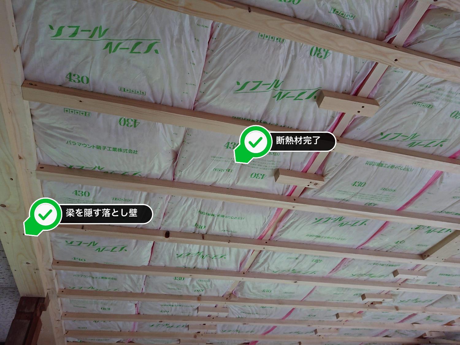 [/box]リビングの天井は、屋根際の梁が大きすぎてキッチンの天井より低くしか作れなかったので、16帖のLDKですが天井は小さな落とし壁を付けて段差を作らせていただきました。