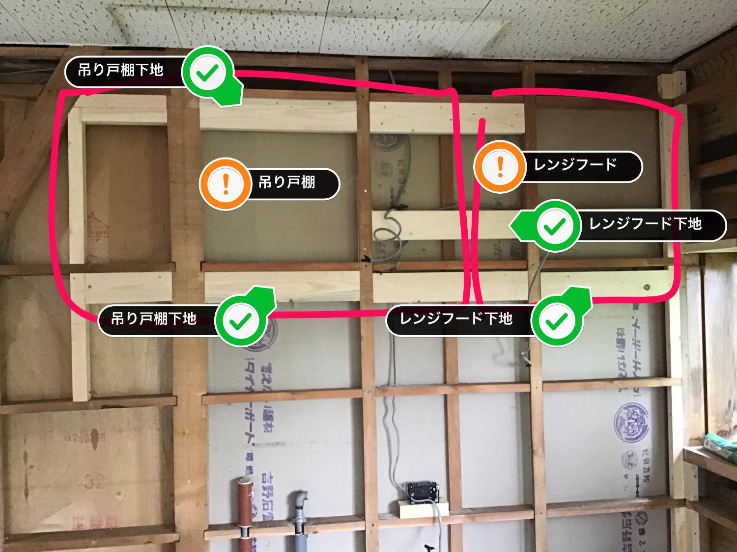 キッチンの壁は吊戸棚やレンジフードを吊るすために下地の補強を行います。他社では下地を組まずにアンカーを使って石膏ボードに吊るすなんて無茶苦茶な事をする方もいらっしゃるようですが、火を扱う場所で上から棚等が落ちるなんてことがあったら。。。ぞっとしますよね。。。ちなみに、今回の壁は現在主流の石膏ボードとは寸法の異なるボードが使われており、下地の距離が違うため、かなり大がかりな下地組みなおしをしていますが、料金は据え置きです!こういった記事を書かせていただけるのも、こういう機会をいただけるからですからね!