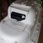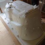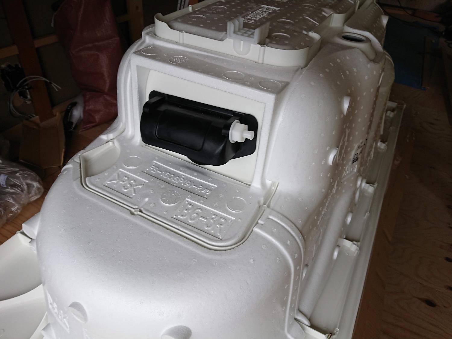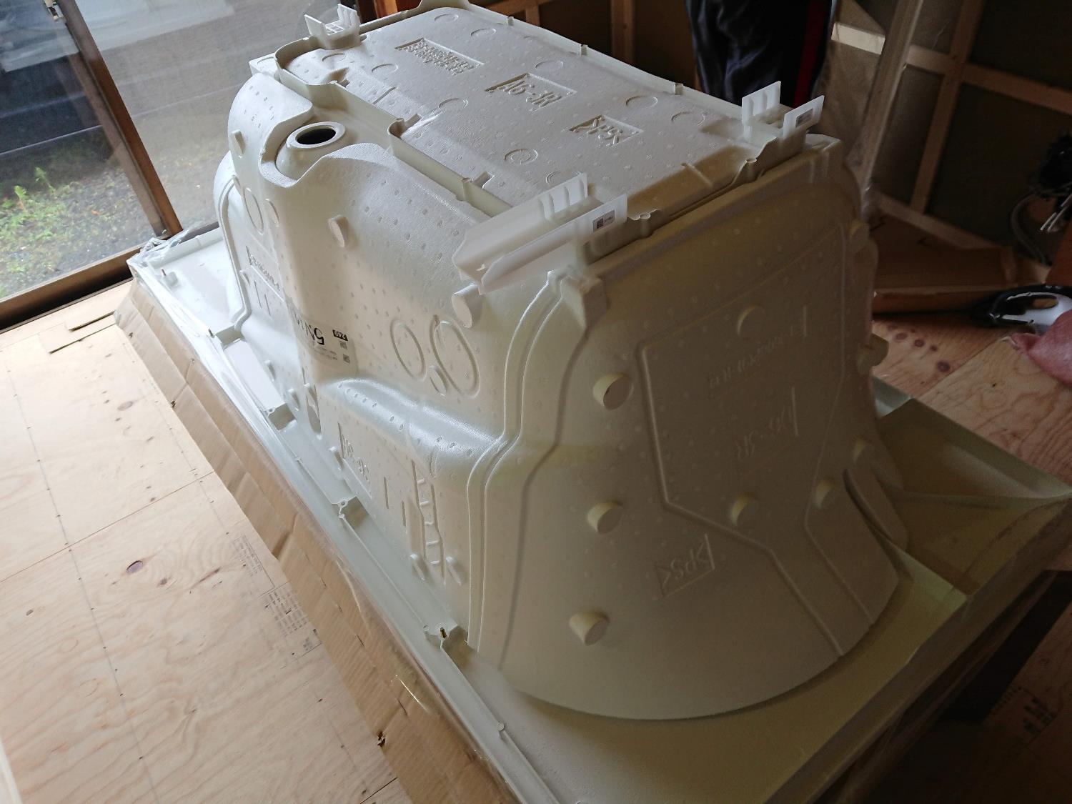浴槽を設置します。まずは裏返して鉄の骨組みに乗る足を取り付けます。その後排水パーツを取り付けてプッシュ排水を取り付けたら設置です。洗い場との境にエプロンをつけて設置完了。このエプロンには給排水の配管に触れるように点検口も入っていますが、普段はカバーで見えなくなっています。排水を繋いだら壁の作業に進みます。※写真はパーツのみですが。