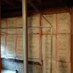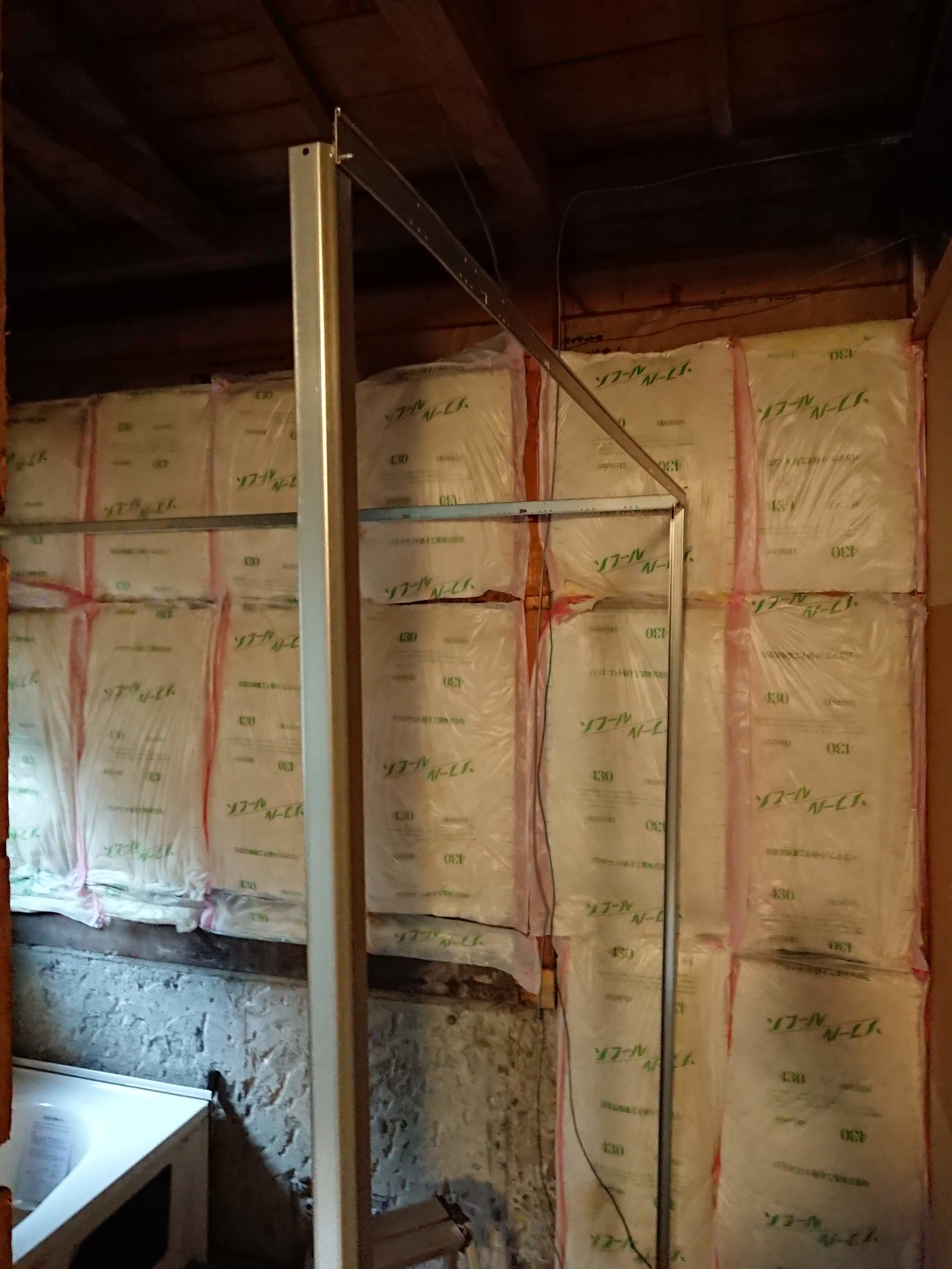 壁はまず骨組みから設置です。この時骨組みだけでは全然強度がありません!壁材を取り付けることで面による強度が出るという感じです。ですので要所要所で水平垂直がずれていないかのチェックを行いながら組んでいきます。