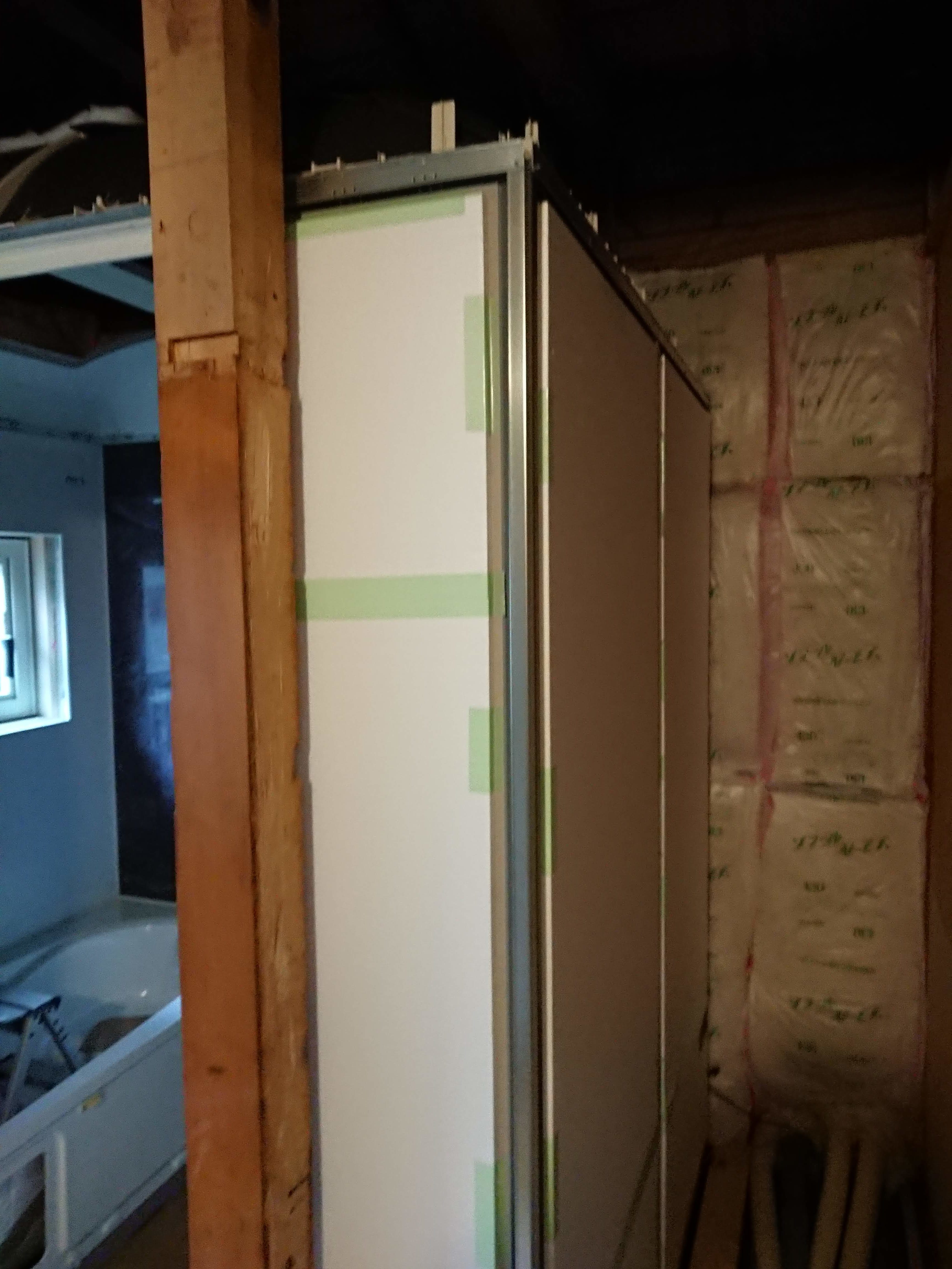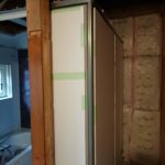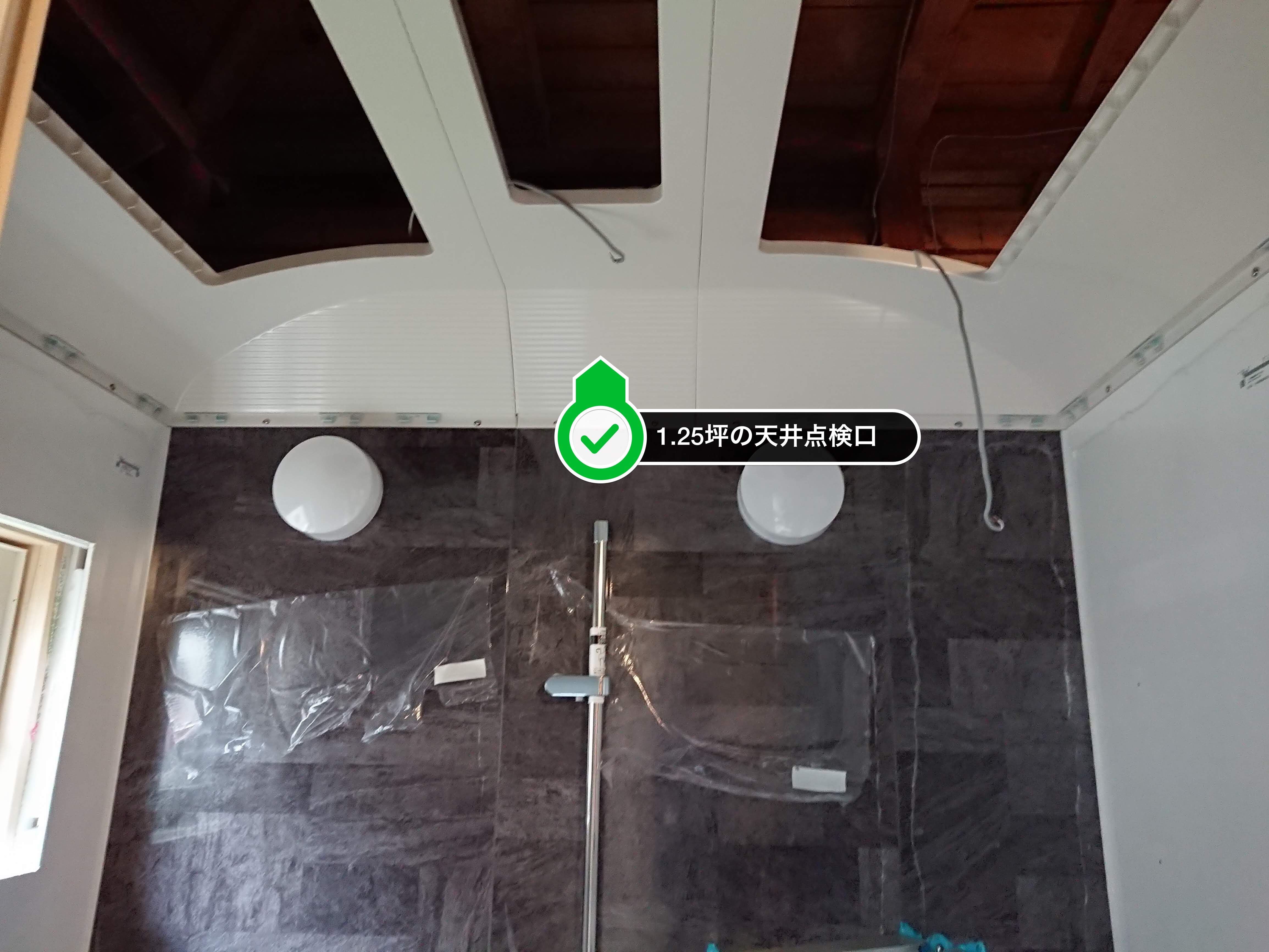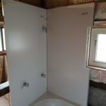 いっきに飛ばして壁が立ち上がったら天井取付です。お勧めはドーム型の天井です。リフォームでは天井の上のクリアランスがどのくらい確保できるかわかりません。予想外の梁なんかも出てきます。天井は以前の事例でもご紹介しておりますが1900mmまで低くはできるのですが、さすがにこのサイズの場合発注前から障害物があると分かっていないといけませんので、現場でカット!という訳にはいかないんです。ドーム型であれば、センターの部分のみ2200mmで端の方は2000mmになりますので、障害物を交わすことが容易になります。また、施工面だけでなく、機能面でも良い点があり、天井の水滴が壁の方に流れやすくなるので、頭の上から水滴が落ちてくる!という事が起こりにくいんです!※わざとシャワーで天井に水滴を作ると普通に落ちてくるので実験になりませんが。。。