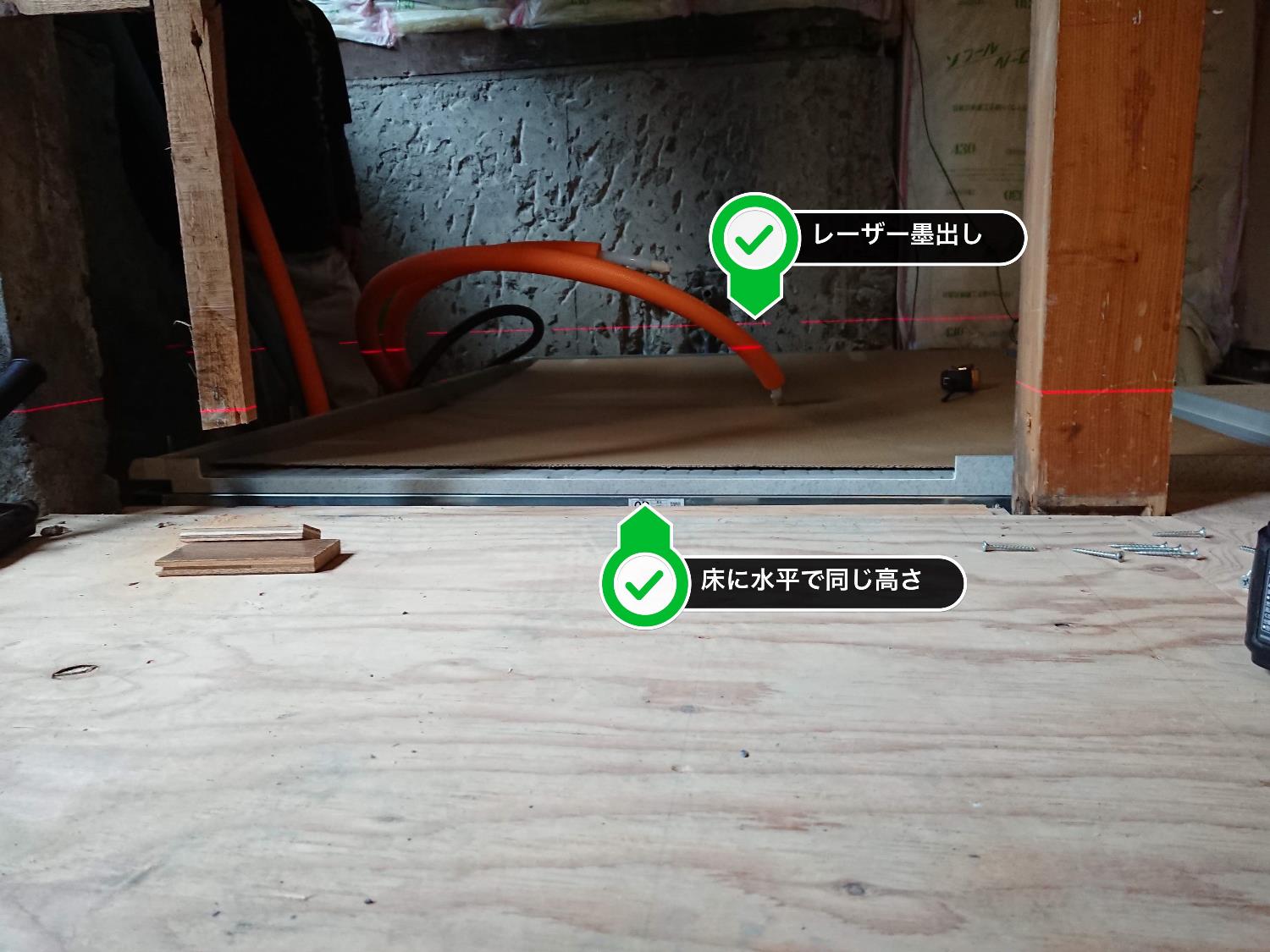 [/box]ユニットバスの床の水平は洗い場の下の金属枠についている4本のボルト足で行います。足の高さは何種類かありますが、基準は475mmのタイプです。メーカーの設定では275mmがベースになっていますが、給排水で何かトラブルが発生したときにこの高さだと床下に人が潜ることが困難になるので、475mmに変更するのが定番です。また、現在はうち組ボルト仕様という骨組みを設置してから床を乗せることができるタイプもありますが、床下のクリアランスが狭すぎてどうしても275mmのボルト足を使わなくてはいけない場合でなければ私は使いません。理由は通常の475mmのボルト足より高価になる点と足が通常タイプより少し部屋の内側に入ってくるので、バランスが悪く感じる点。また接合部にガタツキが起きやすいという点です。※私のお客様ではこのガタツキは起きていませんが、そういう事例を耳にすることが何度かあったので。