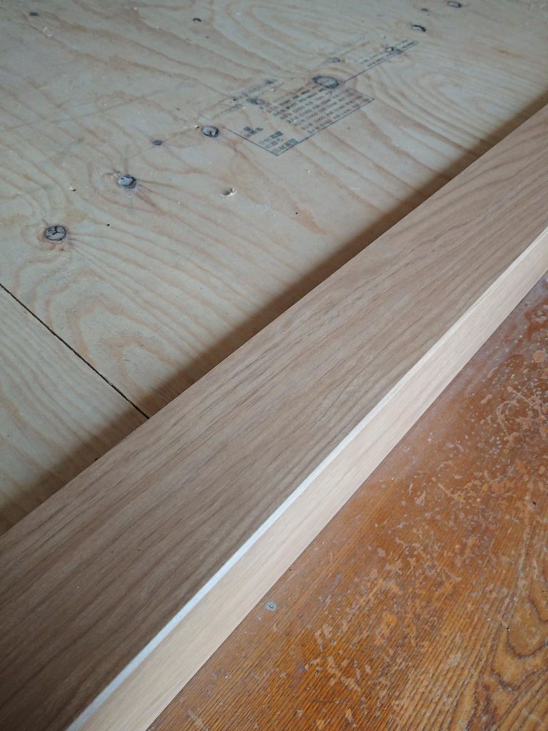 次は重しをして、のりを乾かします。面材に傷をつけずに重しをするために、養生してから角材を乗せ、さらにつっかえ棒という感じです。
