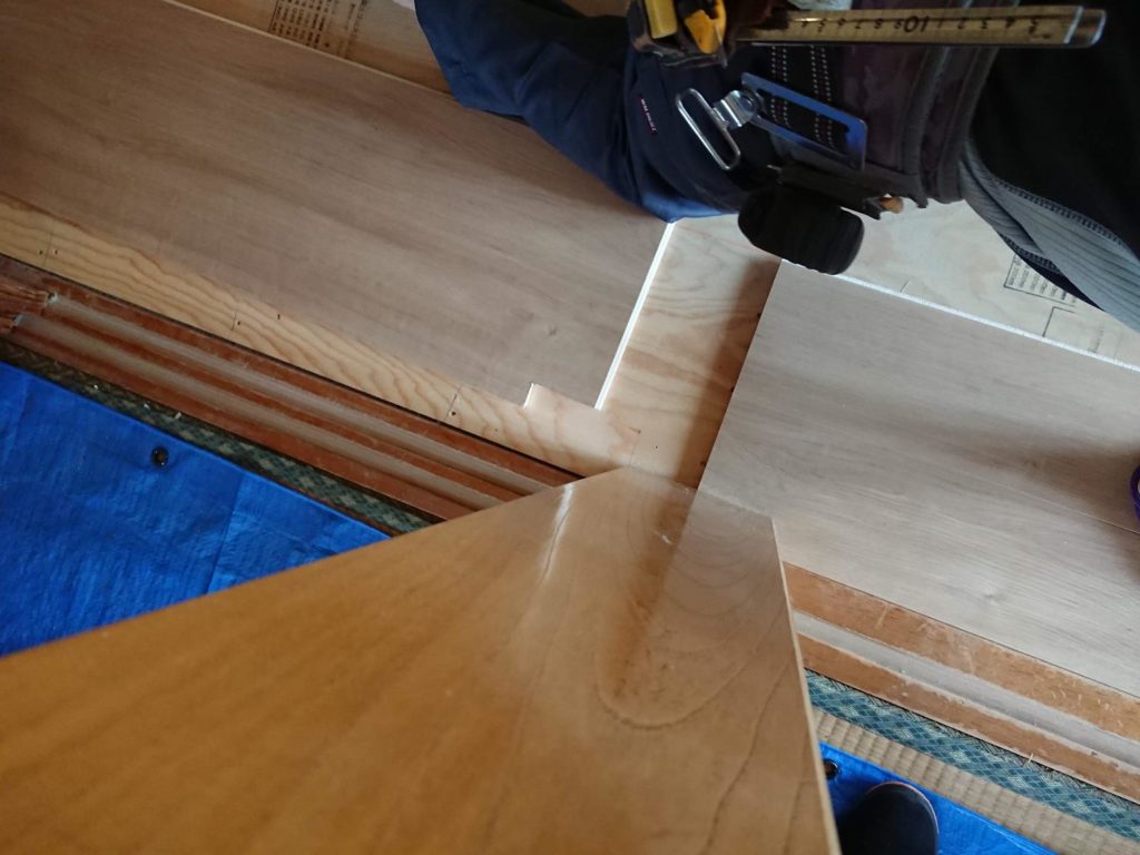まだ、少し書込みが不足していて溝が少しずれてしまいます。こんな微調整を何回も繰り返して部屋の隅の床は作られていくんです!!とても地道な作業ですが、仕上がりの綺麗さにきっちり出てくるので、うちの大工さんは妥協してくれません!!