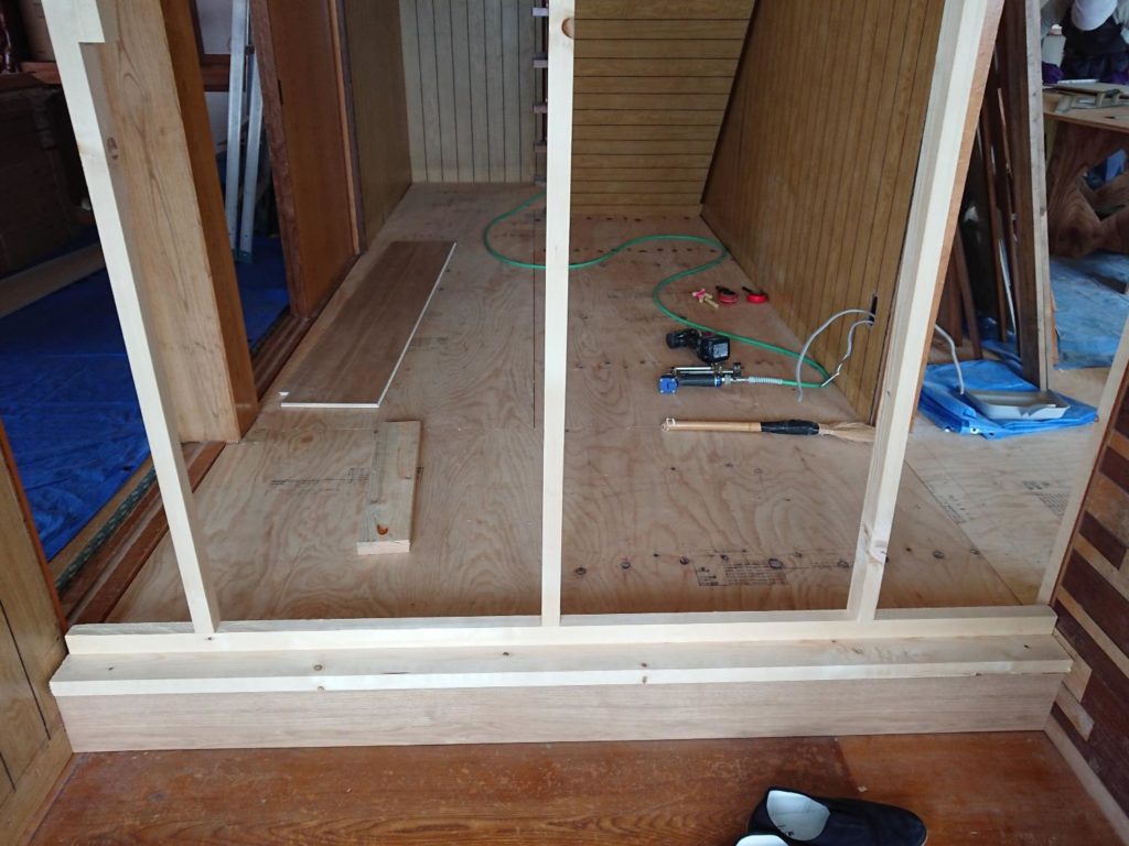 [/box]玄関のフローリングも張替えの今回は、框からの施工になります。リフォーム用の框は何種類かあるのですが、今回は12mmのフローリング材を使用するので同じ高さ用の12.5mmを使います。式台(框より先にある一段低い踏板)はリフォーム用部材が無いので、今回はそのままとしてありますが、表面処理をして塗装というところまではしてあげたいですね。ともあれ、今日は框です!