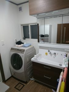 これでも十分使い勝手は上がり、整理ができるし見せなくて良いという状況は作れたのですが、洗濯機の上のスペースがとても無駄だと感じていました。ただし、その場所には換気扇があり、箱型収納を取り付けることは難しく、棚を作るにも見栄えする物と考えると今からではかなり厳しいかなという状況でした。